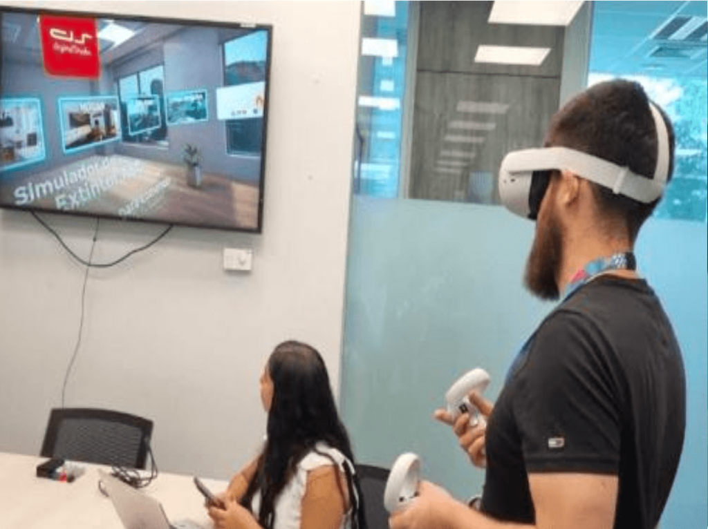 Capacitación práctica con simuladores de realidad virtual y pantalla láser para el uso de extintores.